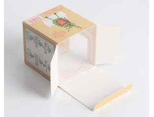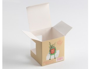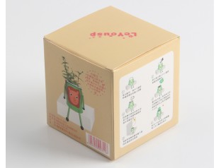 高檔簡易紙盒,采用250g單銅紙,四色印刷,盒身選用PVC透明窗口。將卡通的盆栽的圖文印刷在包裝盒的表面,直觀的表達了包裝盒里的產品。卡通的圖案,結合產品屬性,給人輕松,愉快的購物體驗。