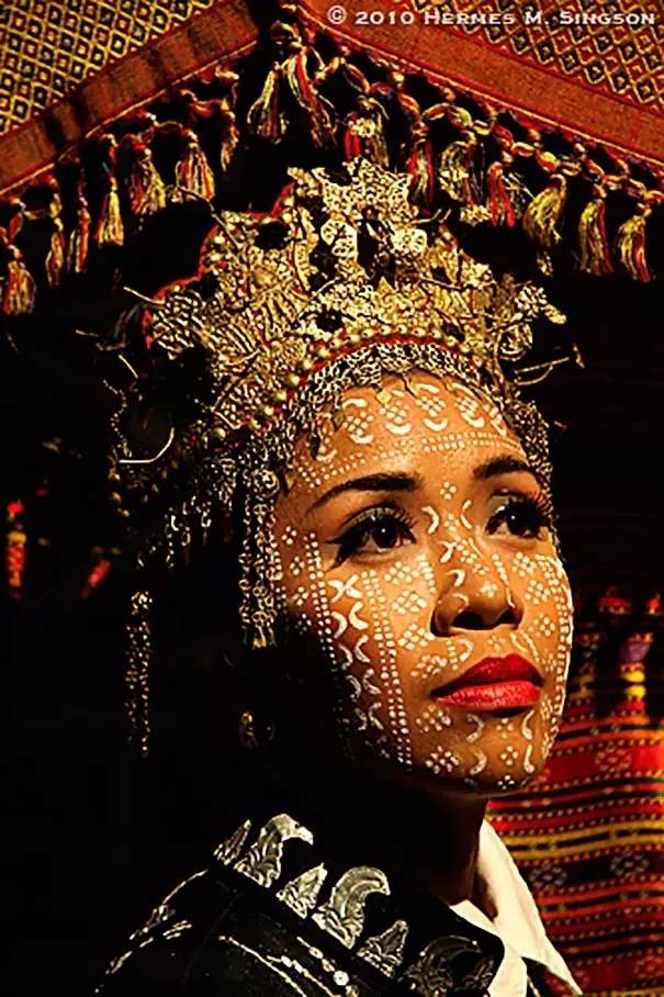 這是菲律賓Yakan民族的傳統(tǒng)服飾。他們婚禮分為兩場(chǎng),分別是伊斯蘭式和古老的傳統(tǒng)儀式。臉上的圖案是吉祥的象征。