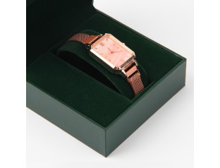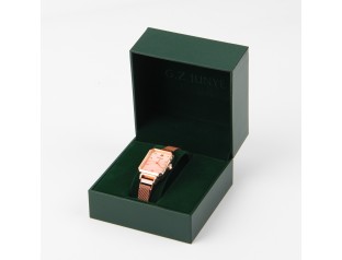 此款手表包裝盒采用了PU皮包膠胚,內置白色EVA內托,可用于手鏈或手表的包裝手表盒設計整體采用了紅色作為盒子主打色,可以很好的吸引消費者的注意。手表盒四邊金黃色的線條邊沿與紅色搭配給人一種很強的視覺沖擊感,華麗而不沉悶。