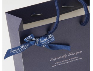 這個袋子使用卡紙為主要材料,觸感柔韌,且印刷出來的效果很是驚艷,作為一個珠寶禮品紙袋,它顯得低調、奢華。這款珠寶紙袋有不同的規格尺寸,客戶可以根據禮品的大小選擇包裝袋,不用擔心看上了它,而它的尺寸卻不適合自己的產品了。珠寶禮品袋子拎手使用和紙袋顏色相同的尼龍材質,觸感柔軟。袋子上的蝴蝶結設計給紙袋增加了一絲俏皮感,打破這顏色的沉悶。