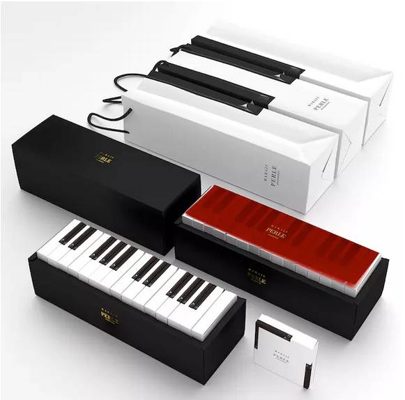 這款鋼琴模樣的蛋糕包裝,是來自日本的創意,設計師非常討喜的將蛋糕紙盒的側面包裝,設計成了鋼琴鍵的樣子,外盒上的黑白包裝也一同呼應了鋼琴的主題。這種能呼應主題的包裝盒設計很是討喜呢。