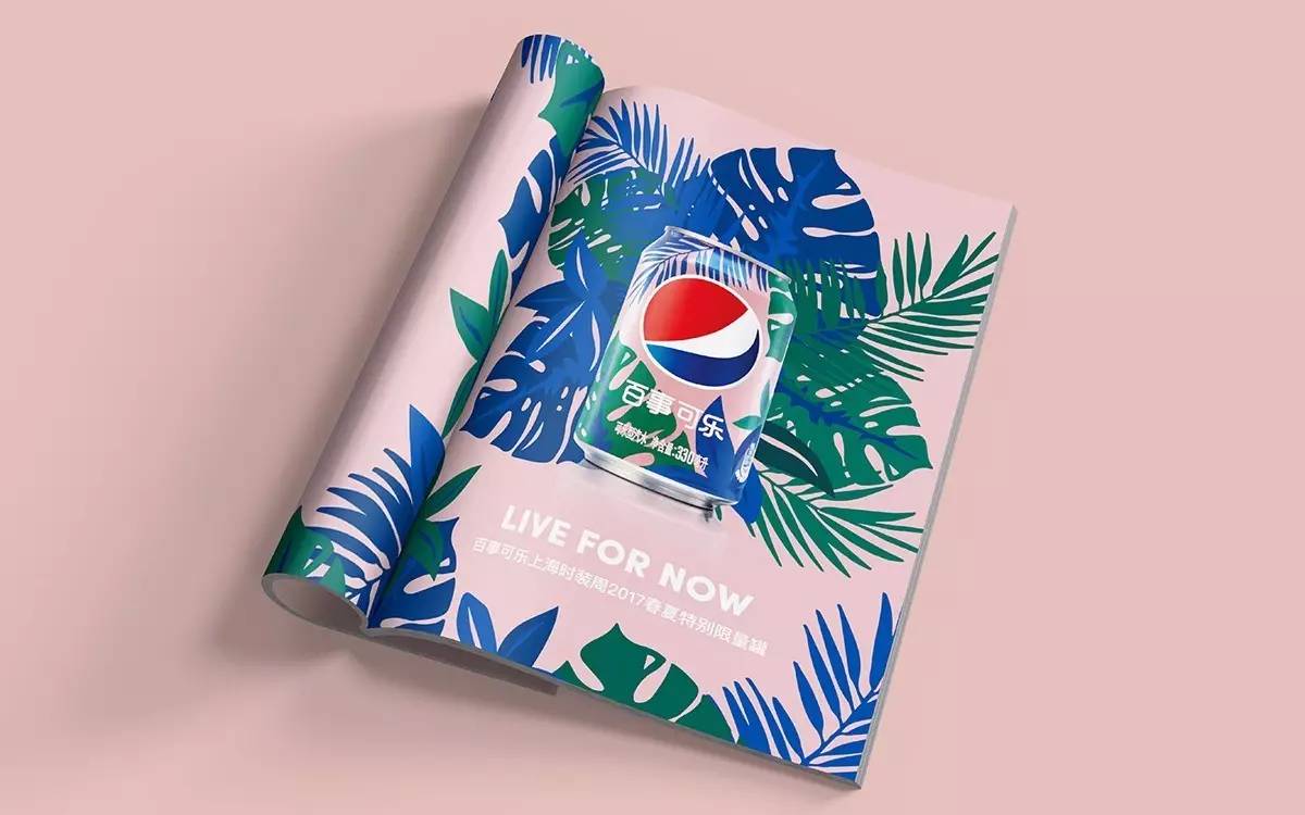 這款限量版包裝是百事可樂為“LIve for Now”精神與上海時裝周特別設計的,在以往的海洋藍中大量加入粉色,加上大面積熱帶的棕櫚葉,喚起了春夏的氛圍,輕松又活潑。