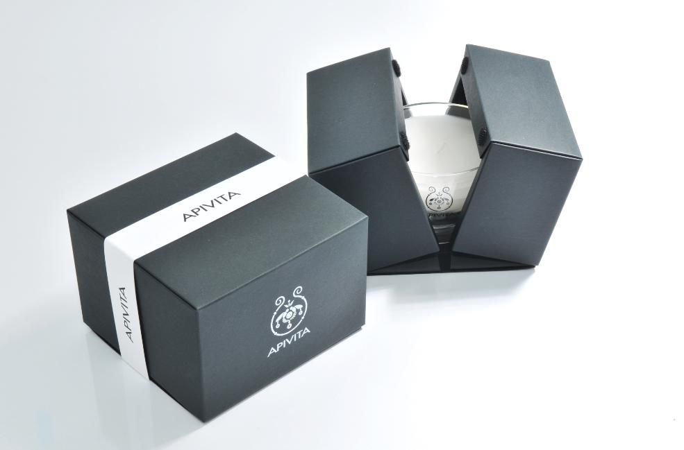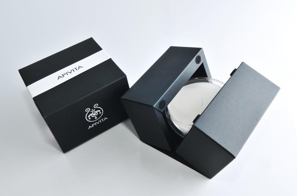 APIVITA香薰蠟燭包裝,黑色卡紙的盒型結構比例合理、結構嚴謹、造型簡單精美,突顯出盒型的形態與材質美,力求達商品保護并襯托出透明蠋臺的層次感,左右開盒的禮盒效果展現商品驚喜的價值感。