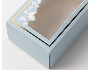 香水盒子定做采用的盒型是PVC開窗盒型,這樣既能夠展現商品,也能讓消費者通過這個PVC窗口看到商品長什么樣,是個雙贏的盒型設計,淡淡的藍色盒身給商品蒙上一層神秘感,很適合用來裝香水的包裝盒。