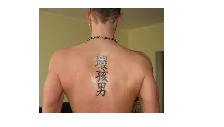 還有這一位Bad Boy,酷到衣服都不穿直接文身,可是親,你這個語序,已經(jīng)酷到深處自然萌了,更別提那描紅一般的正楷字體, 真是不能更正經(jīng)。