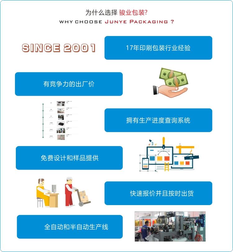 廣州駿業包裝實業有限公司創建于 2001年,是一家以印刷包裝制品為主營業務的集設計、生產、銷售為一體的一般納稅企業,主要生產各種精品包裝盒、紙袋、吊牌,其主要應用于服飾、皮具、化妝品、保健品、禮品、首飾、茶葉、酒類、電子產品及其它日用制品等行業,并通過了德國萊茵認證、BV認證、SGS認證和WCA認證.