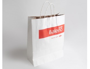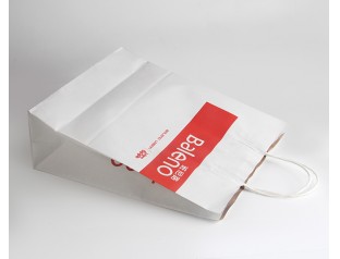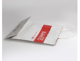 此款手提紙袋采用白牛皮作為原材料,故又叫做白牛皮紙袋,單色印刷,黏紙繩白牛皮紙手感柔軟,厚度均勻印刷效果的優點就是鮮亮,節省油墨,可以有效的降低成本此款白牛皮紙袋,白色LOGO的印刷搭配打底的大紅色印刷,可以使其LOGO更顯眼,彰顯其品牌價值。