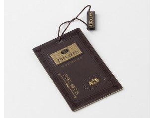 此款服裝吊牌定制采用了400g雙銅紙,吊牌背面上色印刷,加商標LOGO燙金。駿業包裝廠家認為服裝吊牌雖小,但卻是時裝本身聯結消費者的一種紐帶吊牌是現代時裝文化的必然產物,對提高和保護服裝企業的聲譽,推銷產品都有著積極作用