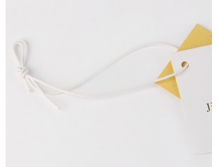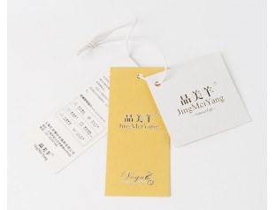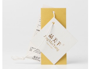 此款服裝吊牌制作采用了400g銅版紙,雙色印刷,商標燙金。服裝吊牌設計采用了小清新的風格,整體以白色為主,搭配黃色,簡約,大方。吊牌設計商標燙金,醒目的燙金LOGO,更彰顯其品牌價值。