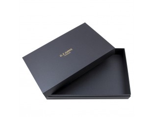 此款皮具包裝盒,表面那磨砂質感的碳黑平面面紙,就知道此包裝是專門為英國產品包裝的。皮具包裝盒,堅硬厚實,表面平滑磨砂質感,光澤靚麗,產品價值檔次瞬間大升。