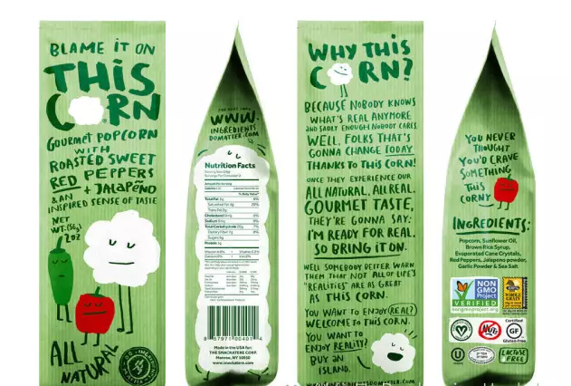 彼得·格雷格森工作室把手工風(fēng)格融入到爆米花的包裝設(shè)計中,滑稽的插圖讓產(chǎn)品看起來非常的俏皮可愛。