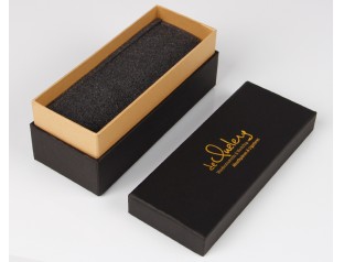 帶圍邊天地蓋禮品包裝盒,采用特種紙裱1000g灰板紙,商標燙金禮品盒內盒采用復合海綿內托,手感細膩,具有較強的回彈性,持久使用不易變形禮品盒包裝設計,選擇黑色作為盒身的底色,醒目的金色LOGO居中,高檔大方。